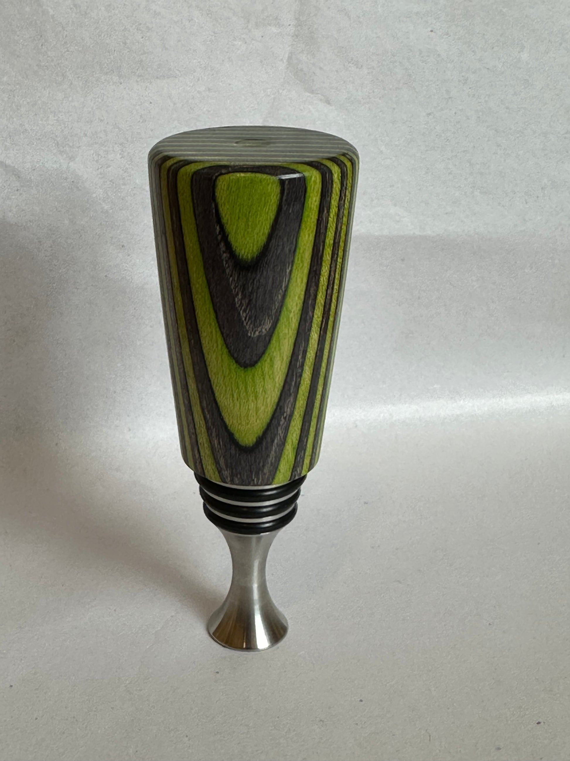 Hand turned wooden, stainless steel bottle stopper. The top is made from green and gray spectra ply, similar in nature to recycled skateboard.