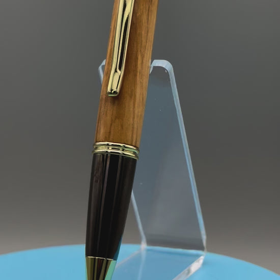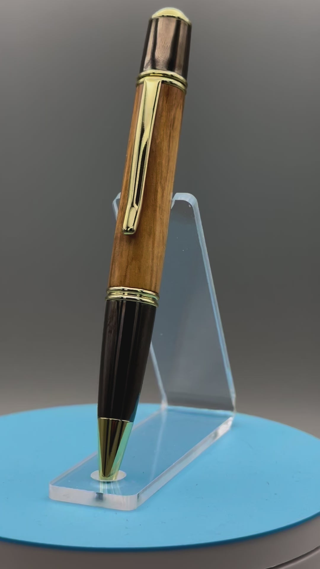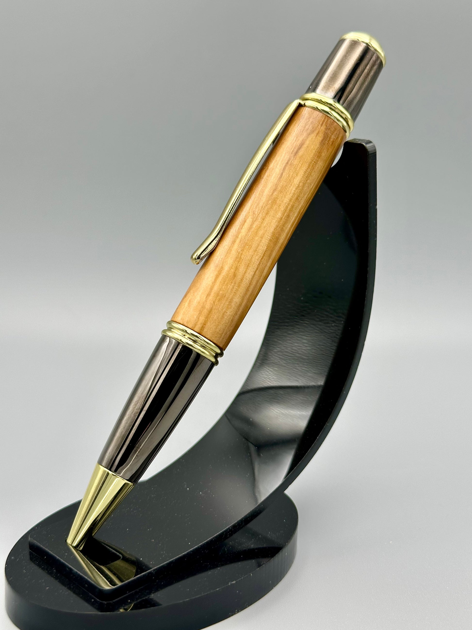 A hefty, elegant light wood with a splash of dramatic grain twist pen in gun metal and gold, this pen will surely impress.