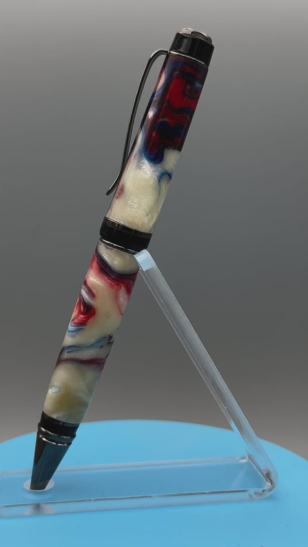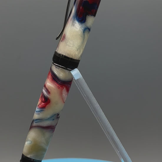 A big, handsome, powerfully built writing instrument. This pen was hand turned from an iridescent resin black featuring a predominately white background with swirls of blue and red, and finished in gold and chrome trim.