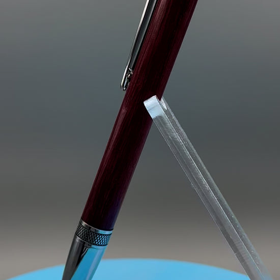 Elevate your writing experience with our Purpleheart Twist Pen! Hand turned from beautiful purpleheart wood and accented with sleek chrome trim, this pen is the perfect combination of sophistication and practicality. A must-have gift for any occasion.