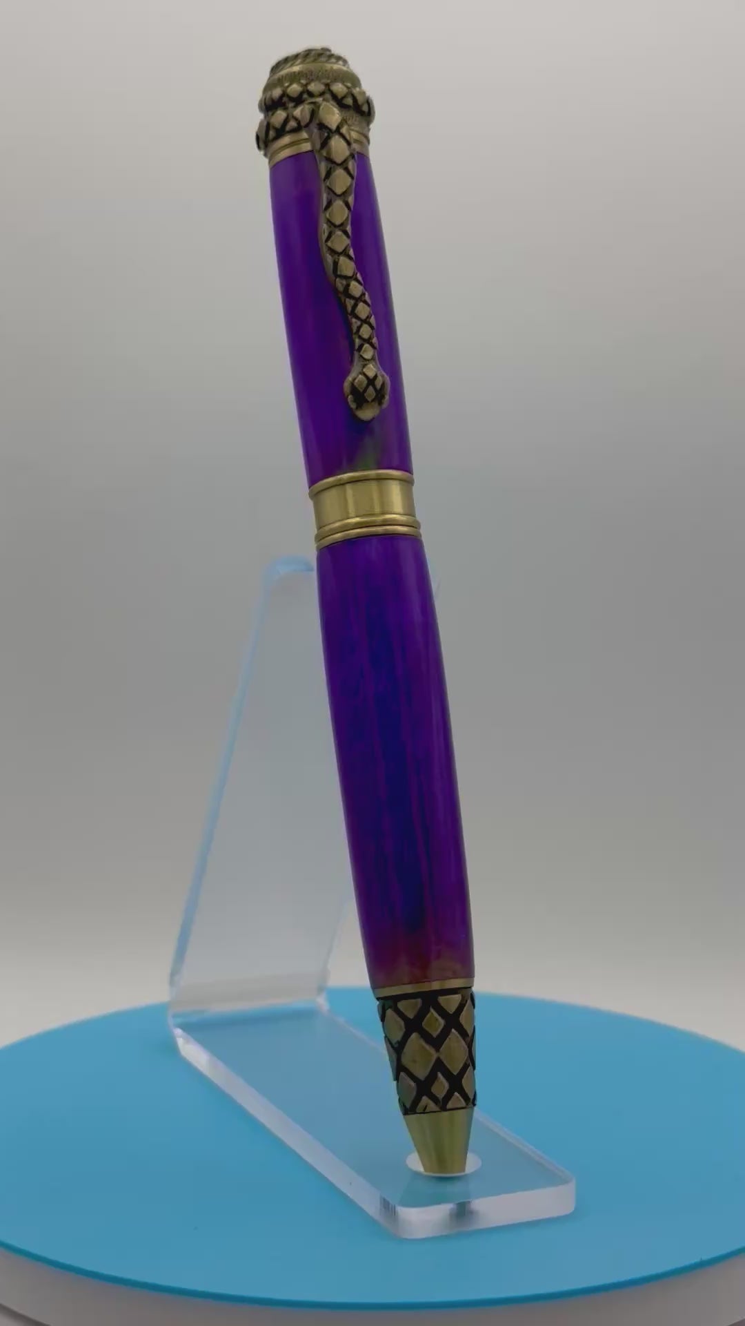 This royal amethyst barrel, paired with antique brass hardware, commands attention with its deep purple tones. The coiled serpent clip gleams warmly, adding an air of luxury to this already regal writing instrument.