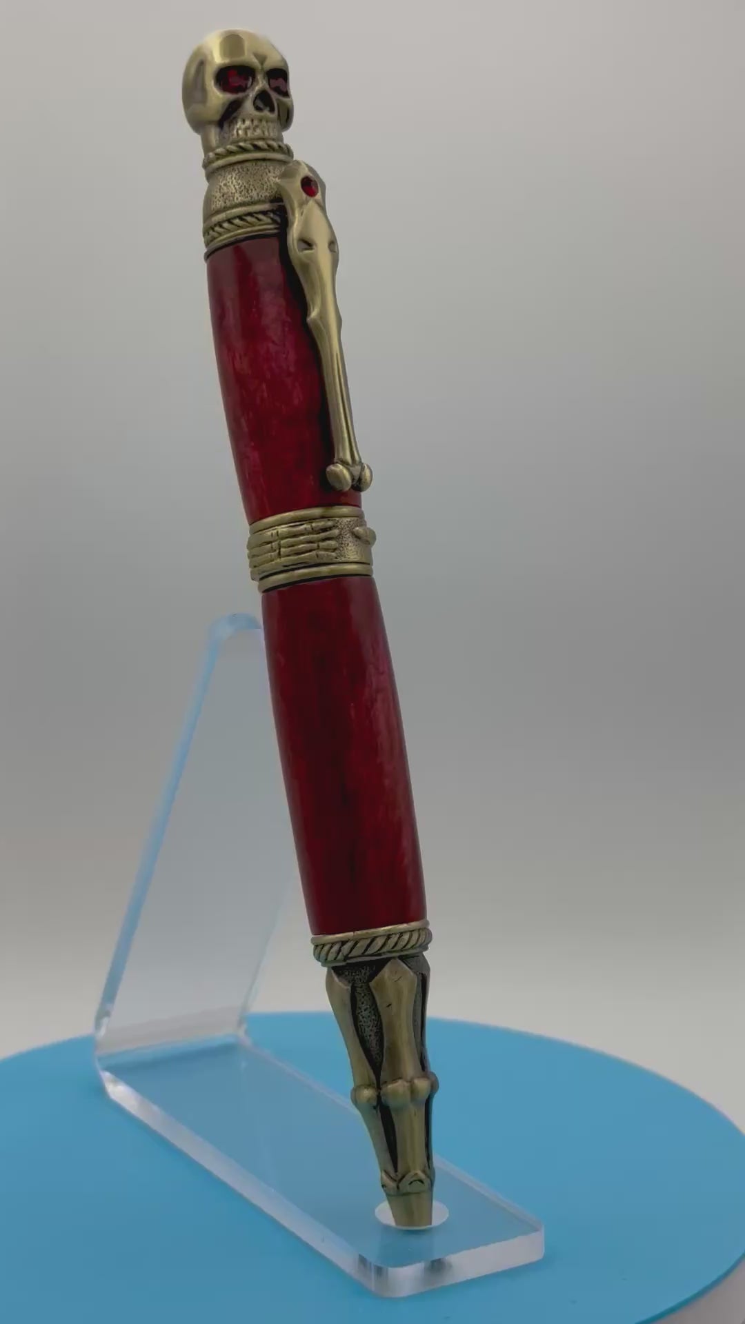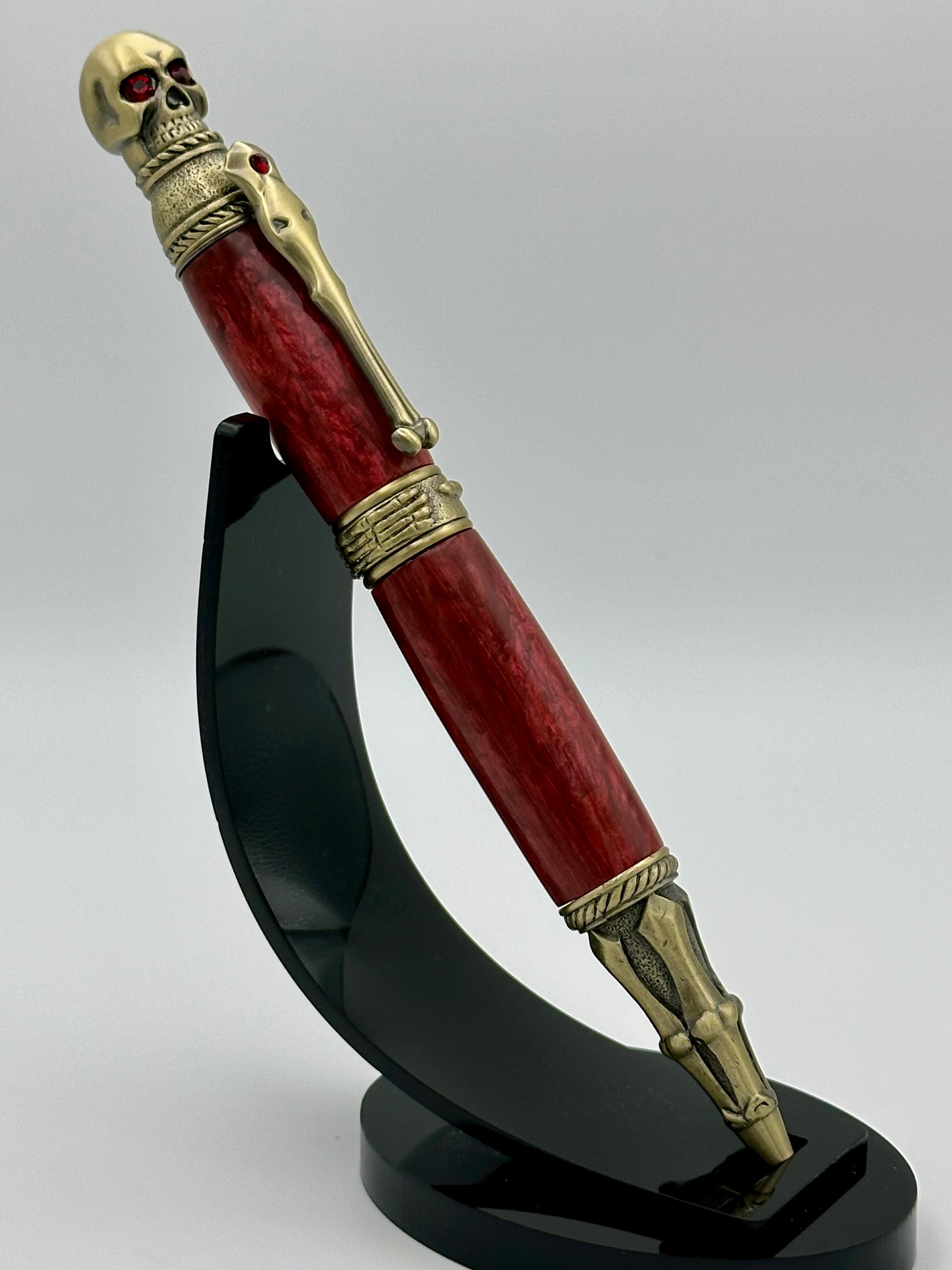 Our Skull and Bones pen sends a bold statement of fearlessness, power, and independence. This striking design features a detailed human skull on the cap with piercing red crystal eyes, a skeletal hand grasping the center band, and bone accents along the clip and tip. The rustic, authentic antique brass finish is crafted from solid brass with a chemically darkened patina, resulting in a gorgeous, long-lasting brown plating with golden undertones.