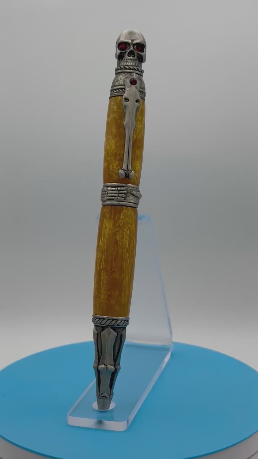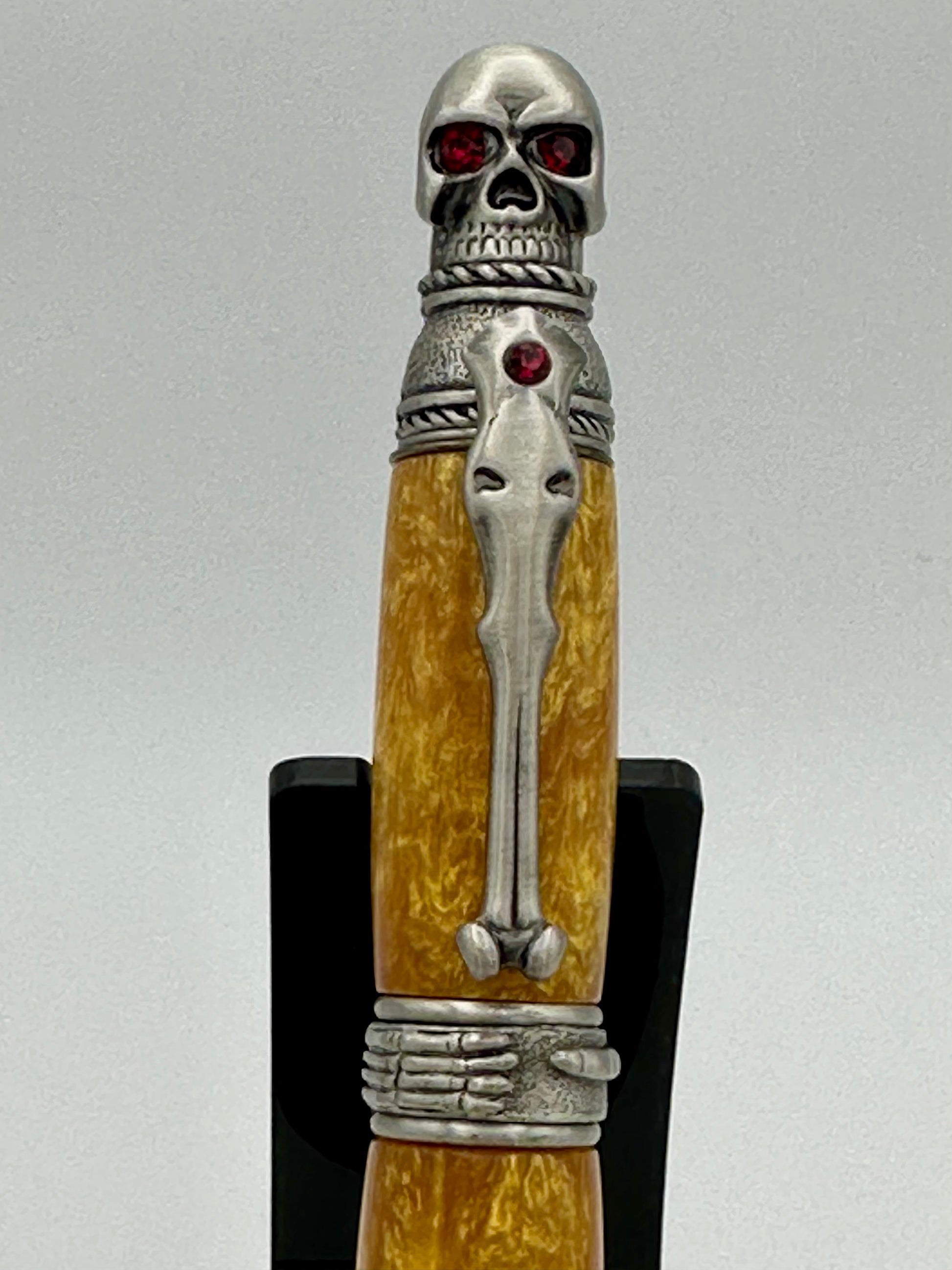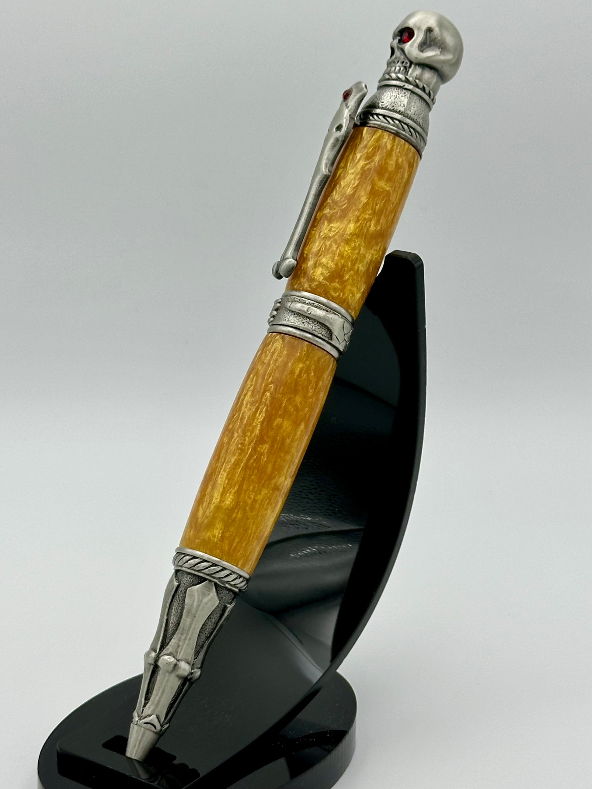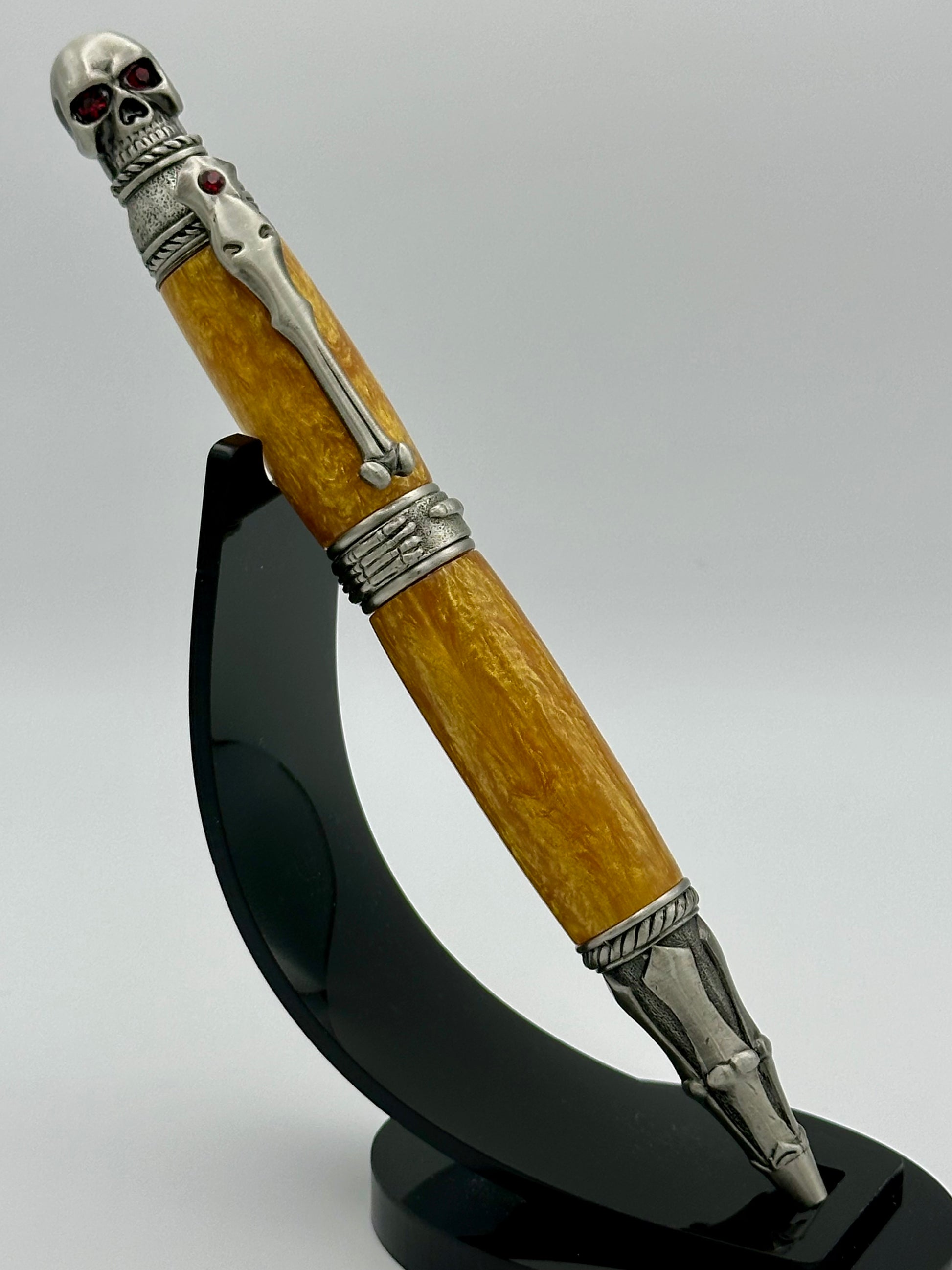 Our Skull and Bones pen sends a bold statement of fearlessness, power, and independence. This striking design features a skull finial, skeletal hand gripping the center band, and bone motifs throughout. The antique pewter hardware captures a time-worn metallic luster, highlighting every carved detail.