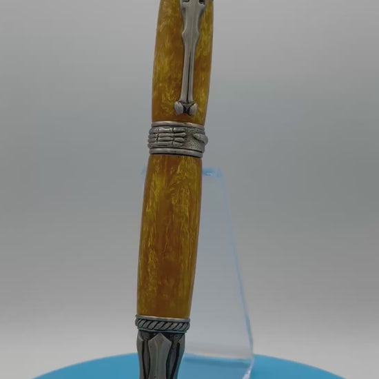 This version gleams with a vibrant golden-yellow resin, evoking the warmth of aged parchment or hidden treasure. The antique pewter trim sets off the rich body color with regal balance and historic flair.