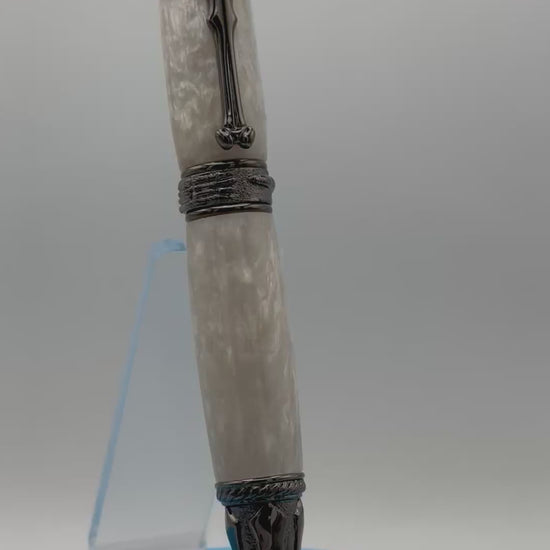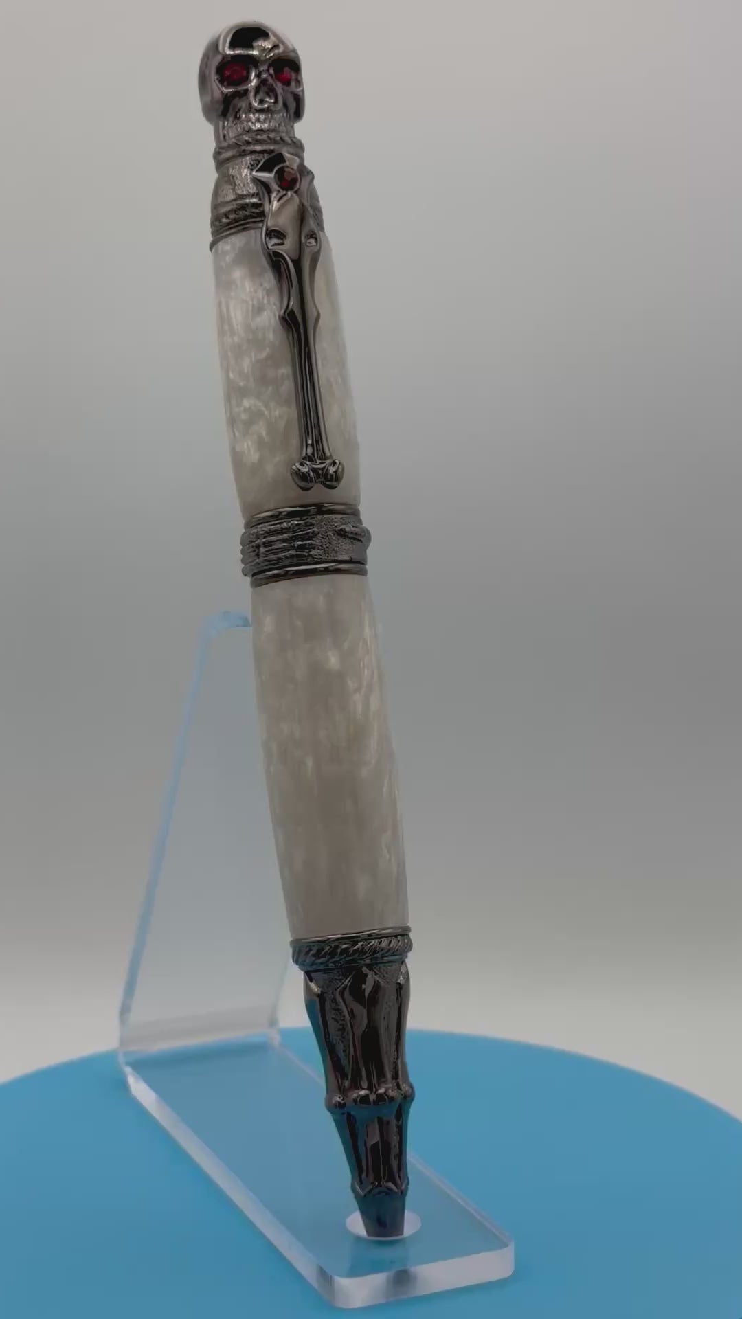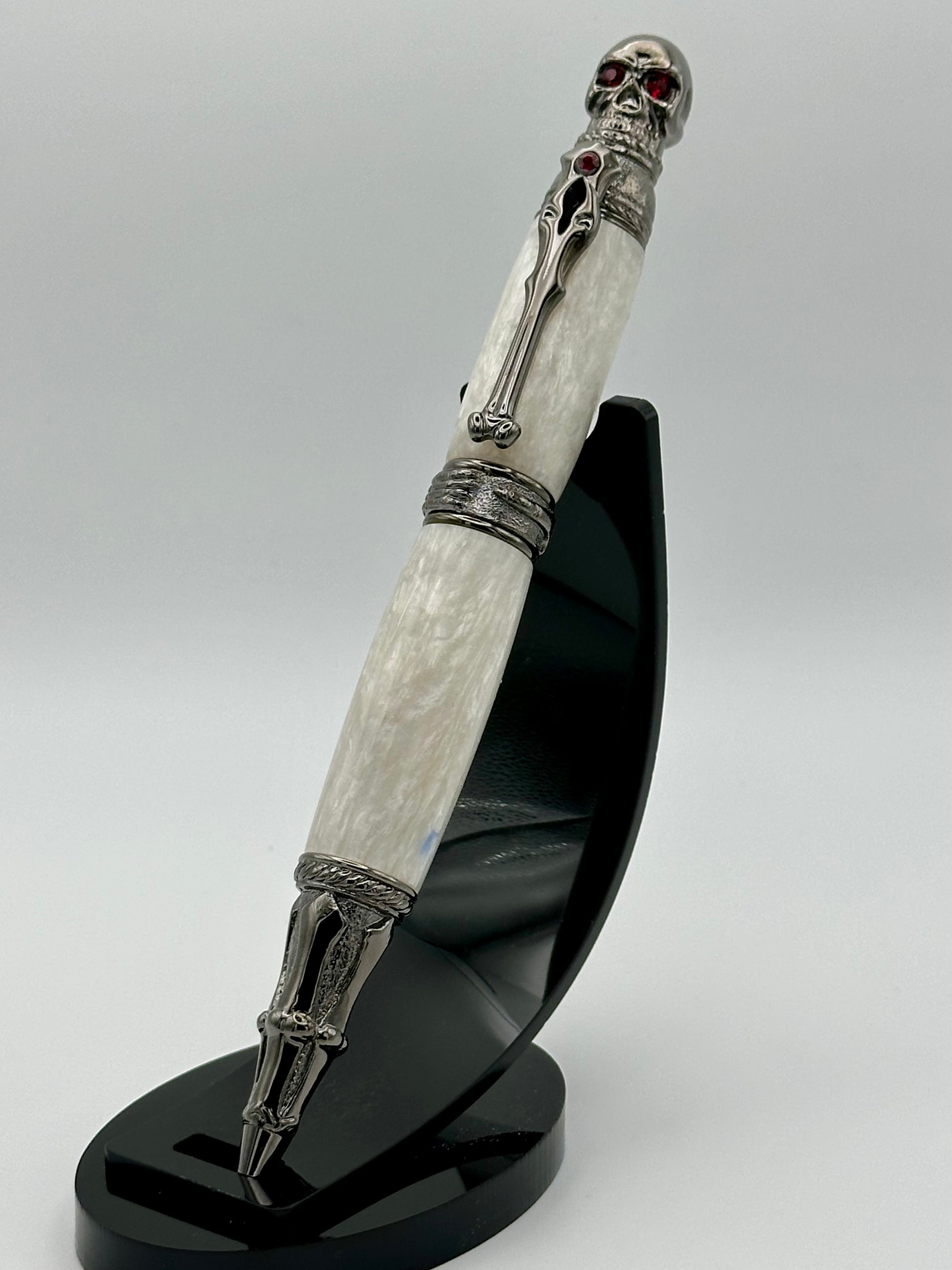 Our Skull and Bones pen sends a bold statement of fearlessness, power, and independence. This striking design features a detailed skull finial, skeletal hand on the center band, and bone accents along the clip and tip. The sleek gun metal finish gives the hardware a modern, shadowy tone that pairs beautifully with lighter resins.