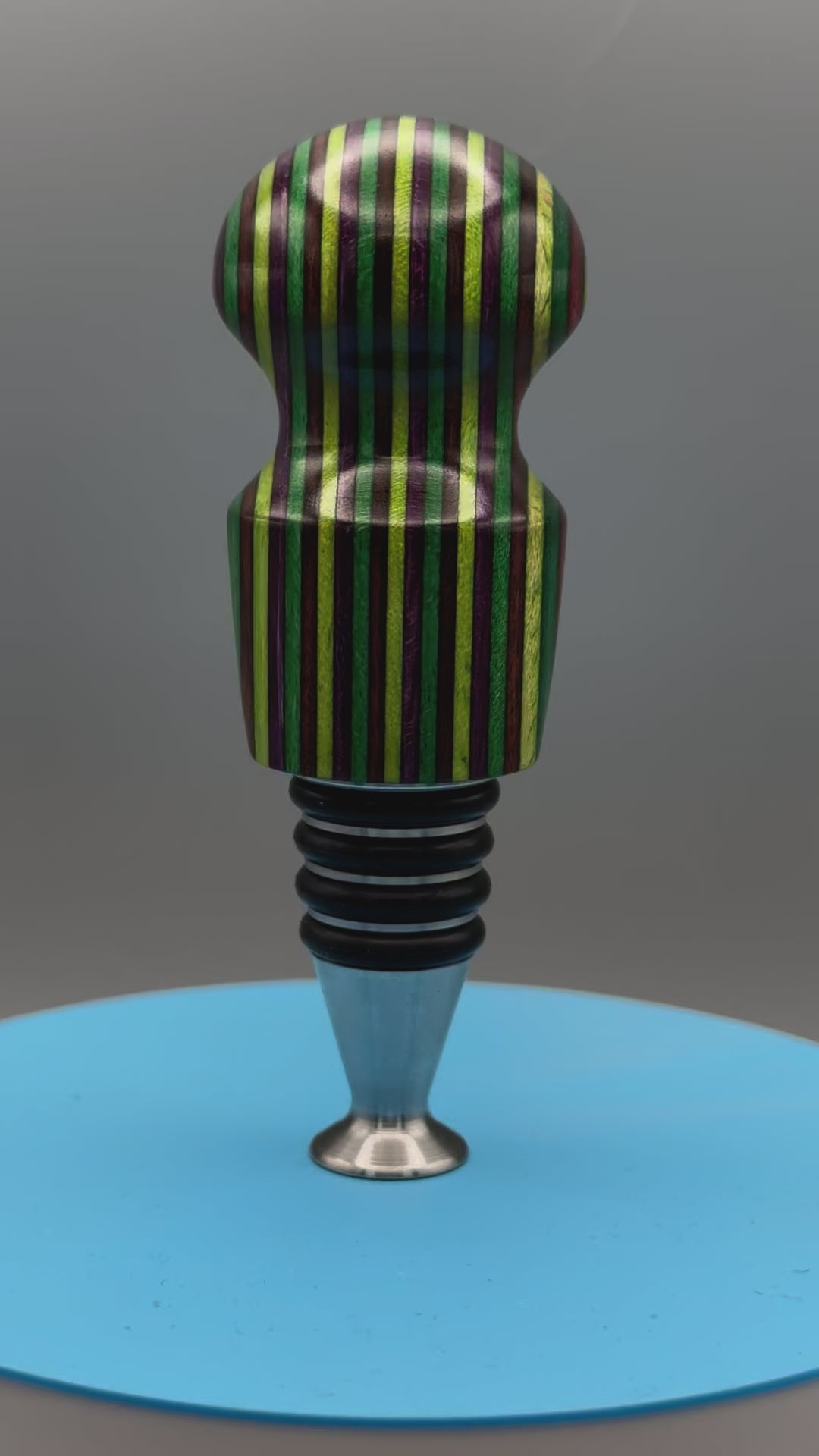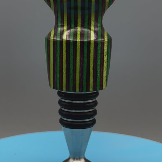 Hand turned wooden, stainless steel bottle stopper. The top is made from charcoal, brown, olive and wine spectra ply, similar in nature to recycled skateboard.