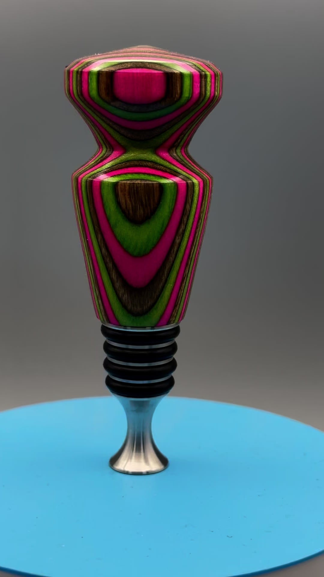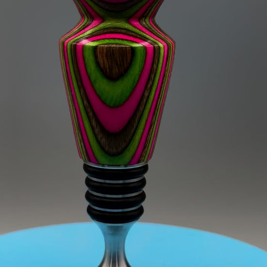 Hand turned wooden, stainless steel bottle stopper. The top is made from pink, green, and brown spectra ply, similar in nature to recycled skateboard.