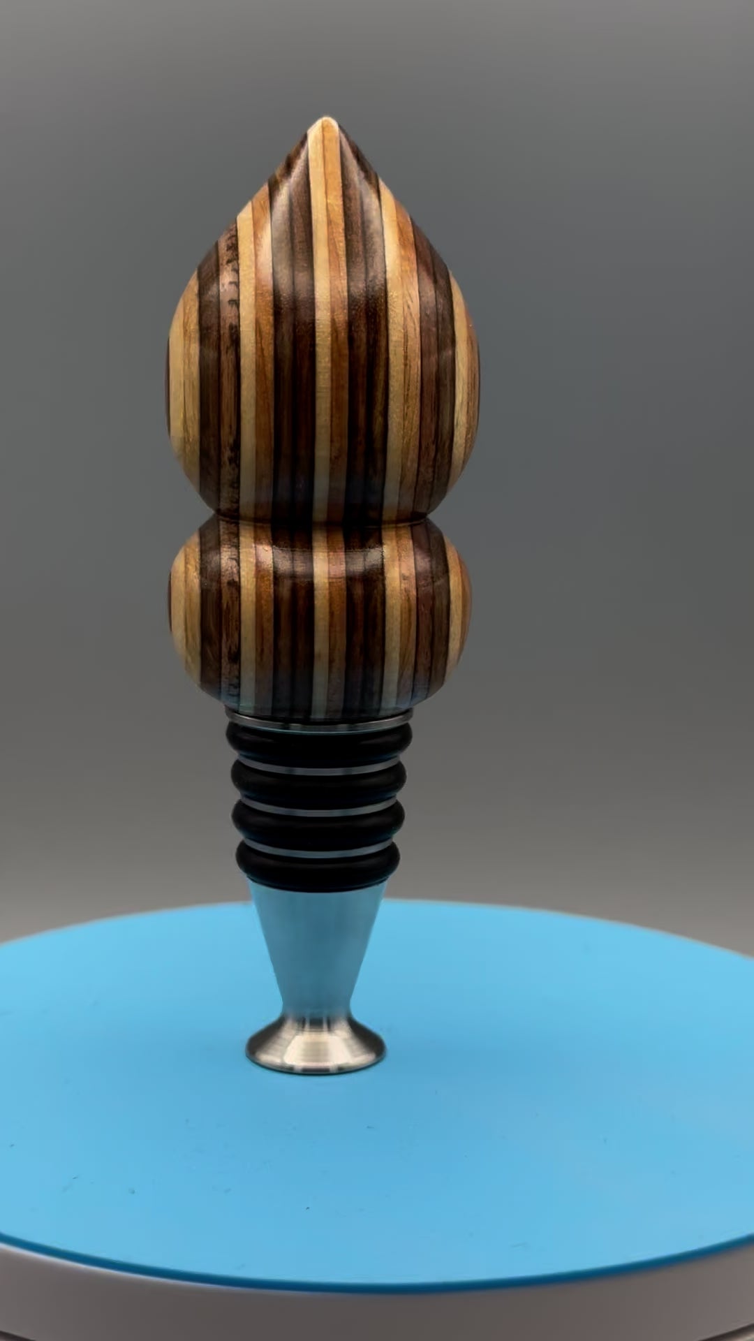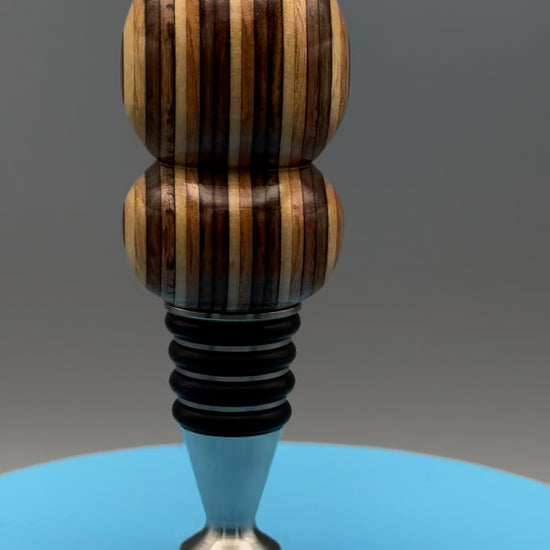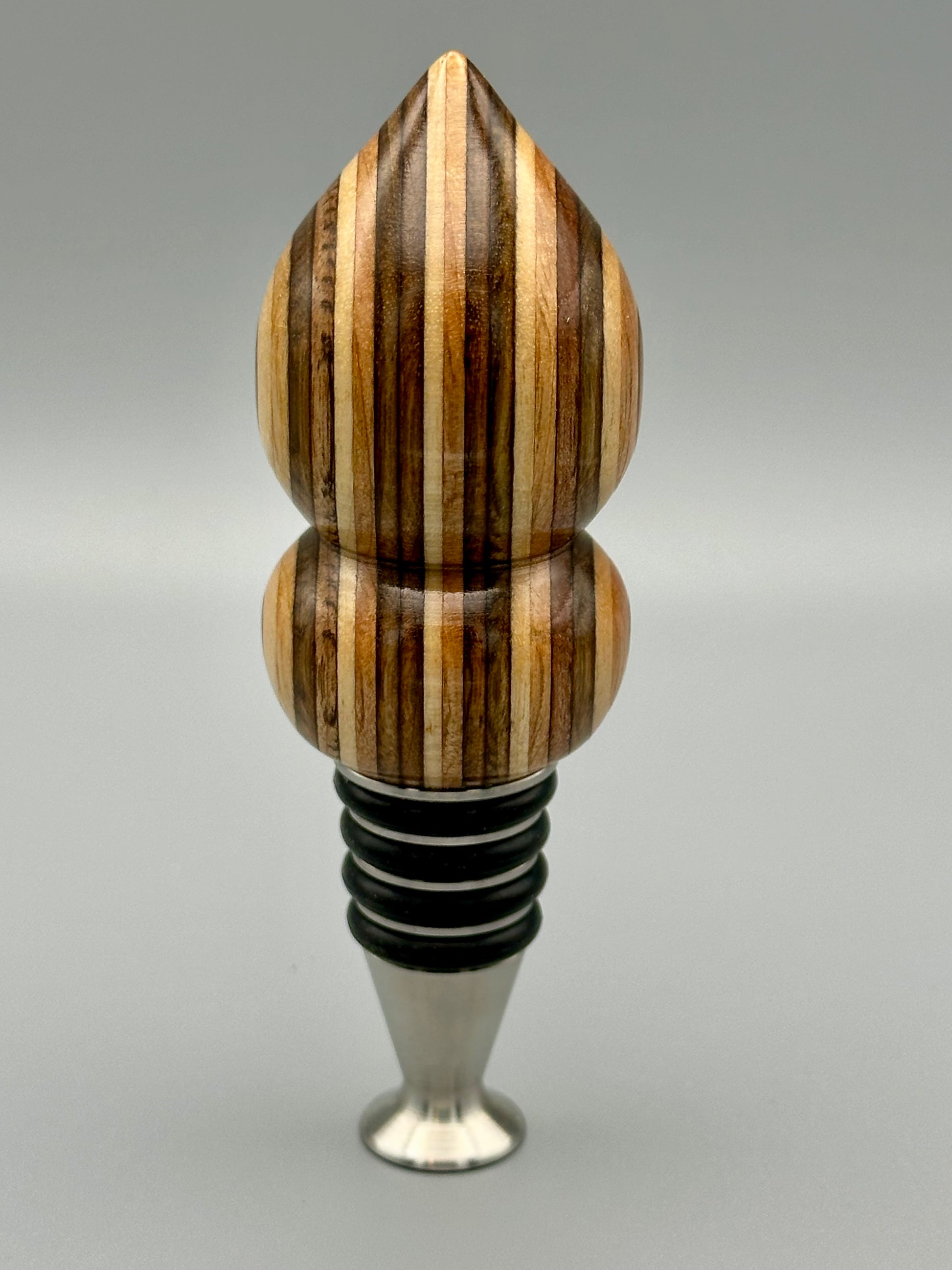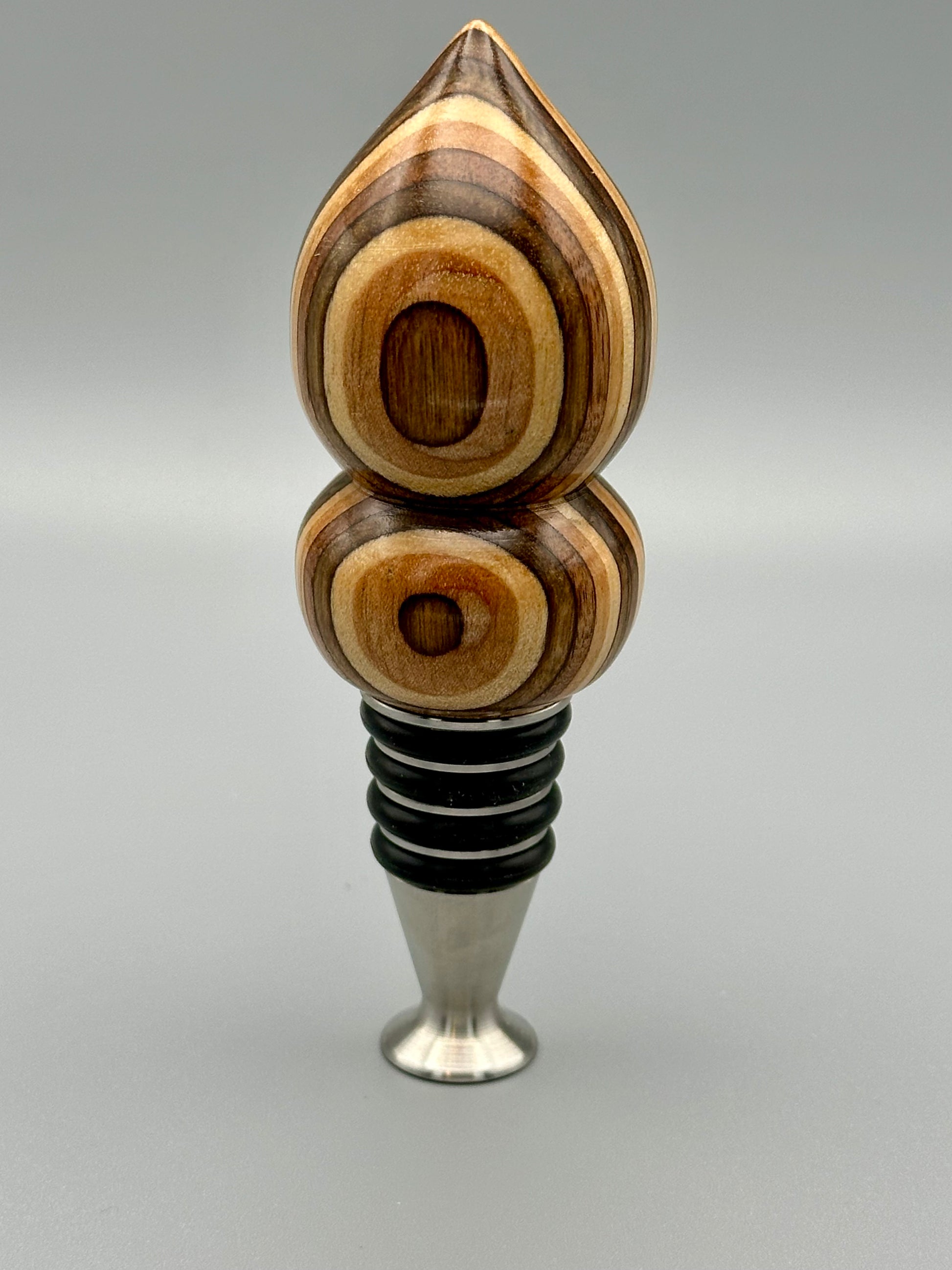 Hand turned wooden, stainless steel bottle stopper. The top is made from dark brown, brown, natural (beige / birch wood) layered spectra ply, similar in nature to recycled skateboard.
